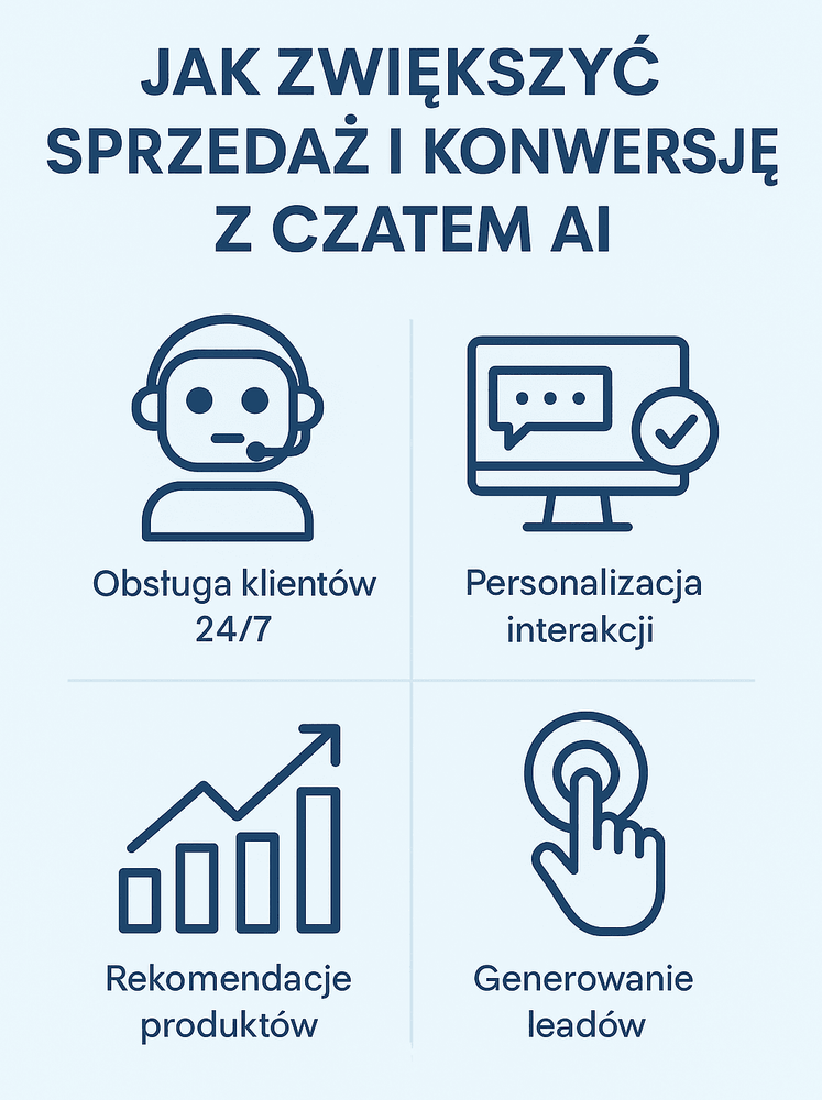 Zwiększenie konwersji i sprzedaży: Chatboty oparte na AI mogą pełnić rolę wirtualnego asystenta sprzedaży dostępnego 24/7. Dzięki natychmiastowym odpowiedziom i kontekstowym rekomendacjom produktowym, potrafią przekonać klientów do finalizacji zakupu. Badania wskazują, że firmy stosujące AI chatboty osiągają 3 razy wyższe konwersje sprzedaży niż te polegające na tradycyjnych formularzach. W niektórych branżach konwersja wspomagana chatbotami sięga nawet 70%. Chatboty mogą także pomóc w odzyskiwaniu porzuconych koszyków poprzez proaktywne zachęcanie do sfinalizowania transakcji i oferowanie spersonalizowanych kuponów czy promocji.